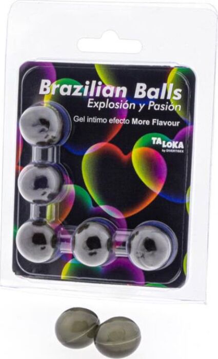 Explosión de placer y sensaciones intensas con las Bolas Brazilian Balls de Taloka. Estas 5 bolas están impregnadas de un gel excitante que libera sabores al contacto con el calor corporal, proporcionando una experiencia aromática y placentera.