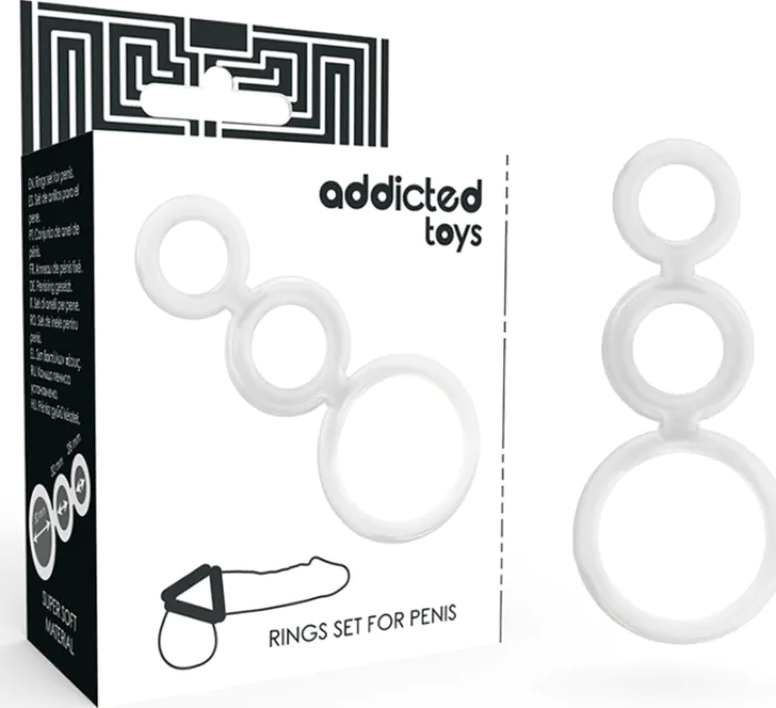Potencia tu placer con el set de anillos para el pene de ADDICTED TOYS. Diseñados para evitar la eyaculación precoz y proporcionar firmeza. Ideales tanto para principiantes como para expertos.