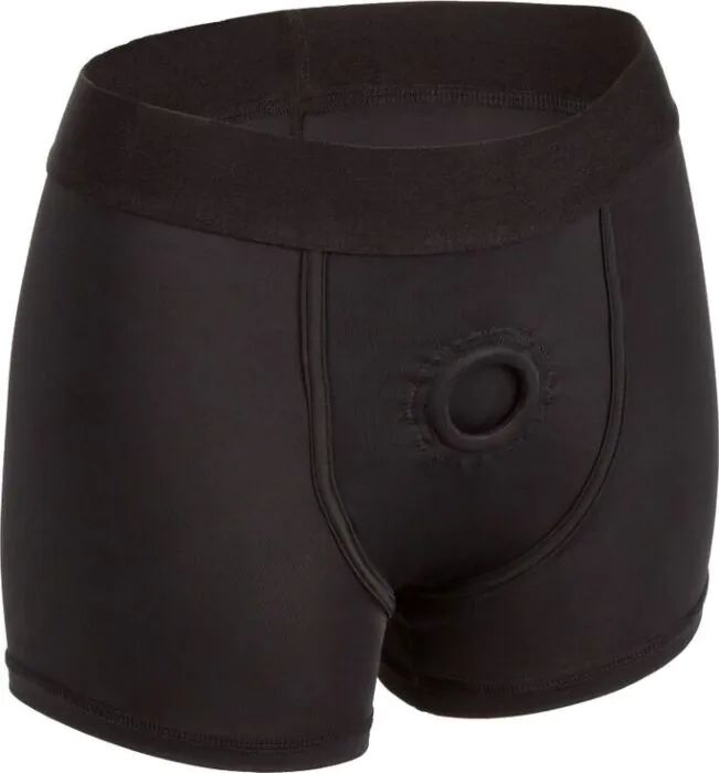 Este arnés estilo bóxer de CALEXOTICS es una opción cómoda y práctica para llevar un consolador, empacador o sonda con sujeción segura. Está diseñado como unas calzoncillos ceñidos con pretina ancha y tejido elástico, así que se siente como ropa interior pero con la ventaja de un bolsillo interno y un o-ring reforzado que se estira para adaptarse a la mayoría de dildos, sondas o empacadores.