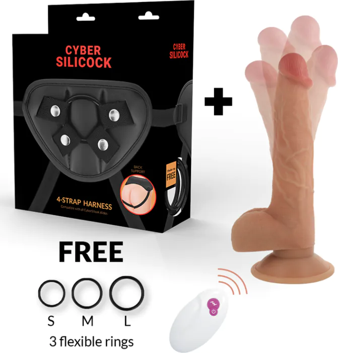 Kit de arnés con dildo de 'CYBER SILICONE SKIN' pensado tanto para quien prueba un arnés por primera vez como para usuarios con más experiencia. Incluye arnés de vinilo ajustable, tres anillas de silicona para distintos tamaños y un dildo recargable con control remoto y funciones de rotación y Up & Down. Buena opción si buscas un kit completo y recargable con acabado realista.