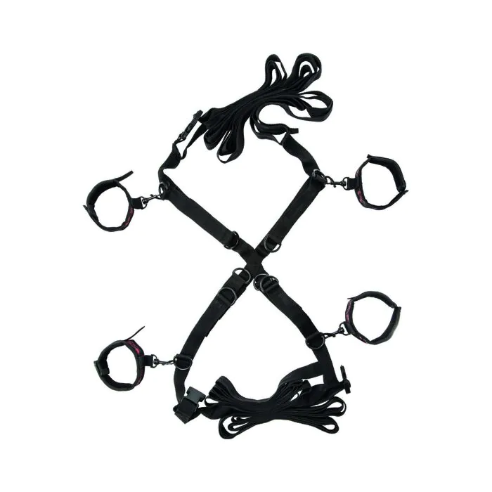 Elegante conjunto de ataduras para la cama con esposas para muñecas y tobillos para disfrutar al máximo de las más fantásticas experiencias.