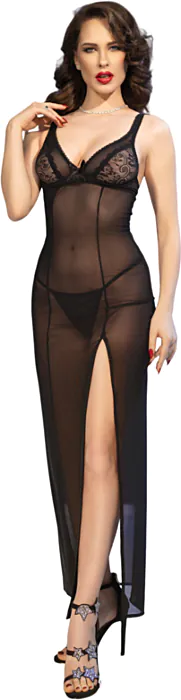 Un babydoll negro de encaje semitransparente que resalta tu figura. Con ajuste en la espalda y tanga a juego, es ideal para noches especiales.