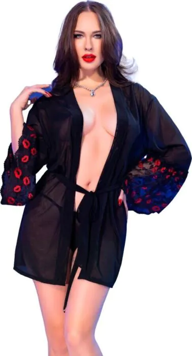Seduce con este babydoll que acaricia la piel con su suave malla transparente y te envuelve en un aire de misterio. Las mangas anchas, adornadas con encaje y besos rojos, añaden un toque juguetón y provocativo que despierta la imaginación. Gracias a su lazo ajustable en la cintura, se adapta perfectamente a tus curvas, realzando tu silueta de forma atractiva.