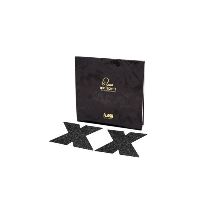 ¡Despierta a la superheroína que llevas dentro con las Bijoux pezoneras flash cruz negro! Conviértete en la protagonista de tus propias fantasías y haz que sucumban ante el poder de tus encantos más seductores. La colección FLASH te ofrece la posibilidad de brillar con luz propia gracias a estas decoraciones corporales autoadhesivas de un negro intenso y deslumbrante.
