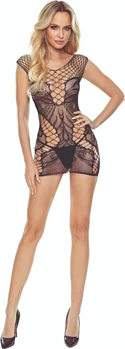 Este bodystocking de encaje negro combina texturas y cortes provocativos para realzar la figura femenina. Ideal para quienes desean sentirse sensuales y elegantes.