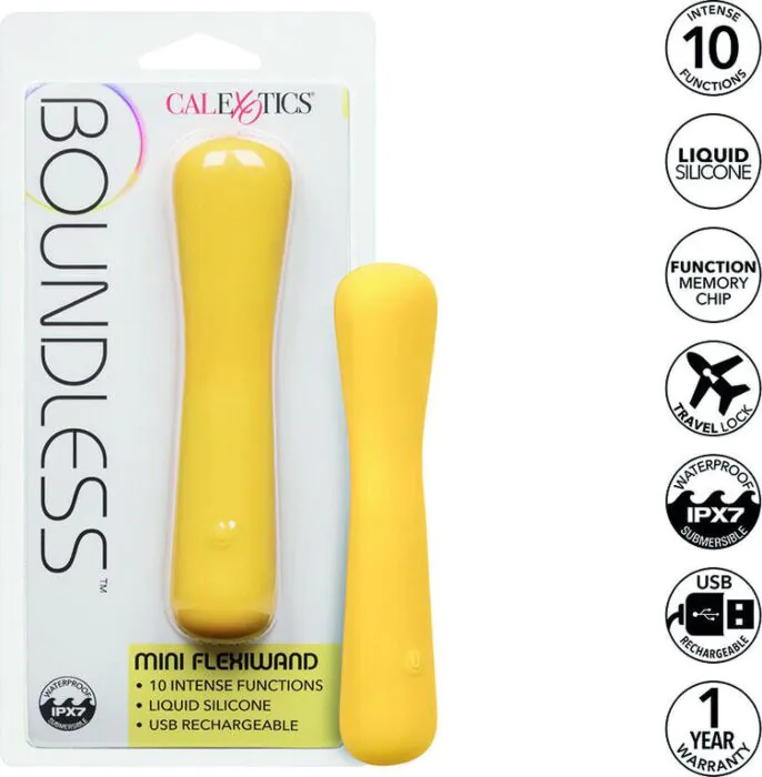 El Boundless Mini Wand de CALEXOTICS es un masajeador flexible que se adapta a tus deseos. Con 10 funciones intensas y fabricado en silicona líquida, ofrece una textura suave y lujosa.