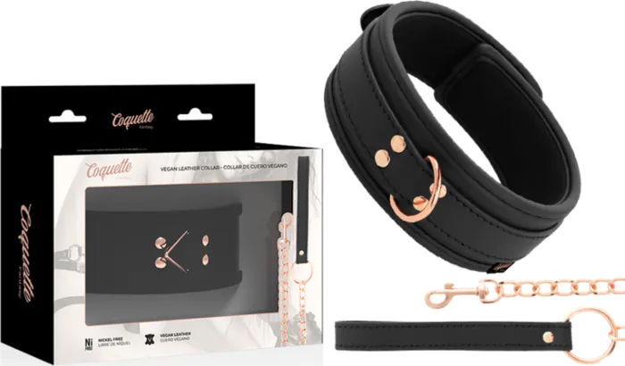 Dominio y sumisión en un accesorio que combina cuero vegano y metal 100% libre de níquel. El collar Coquette Chic Desire te ofrece un aro grande para el cuello y un aro pequeño de metal con correa, indicado para mantener el control en tus juegos BDSM.