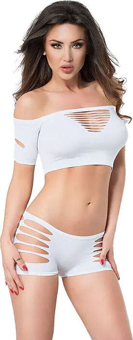 Conjunto de dos piezas en blanco, ideal para quienes buscan elegancia y comodidad en su ropa íntima. Las aberturas aportan un toque coqueto y versátil.