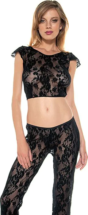 Es un conjunto formado por pantalón y top en encaje de la marca Music Legs. El top incorpora pequeñas mangas, lo que le da más cobertura en los hombros, y el pantalón mantiene la línea delicada del encaje. Es una prenda pensada para uso como lencería, cómoda y de apariencia cuidada, con un tejido ligero que marca la silueta sin estructuras rígidas.