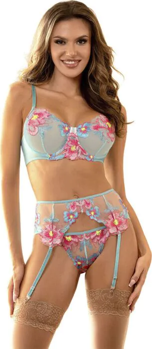 Descubre un conjunto de lencería que realza tu feminidad con elegancia. Su diseño en malla translúcida y detalles florales son perfectos para destacar tus curvas.