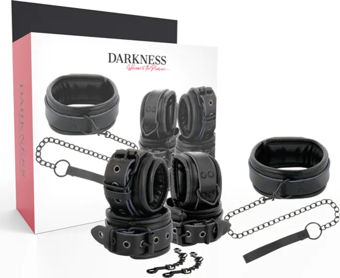 Experimenta el juego BDSM con el set de collar y esposas de cuero de DARKNESS. Diseñado para principiantes y avanzados, ofrece comodidad y seguridad en cada uso.