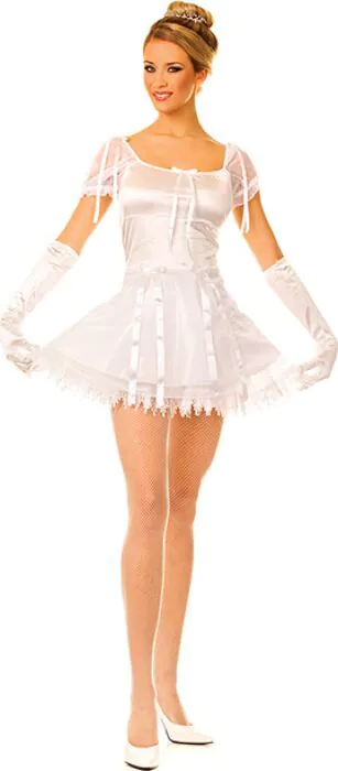 Este conjunto reproduce el clásico look de bailarina pero con un acabado de satén brillante que aporta tacto suave y cierto brillo al movimiento. Los detalles de tul añaden volumen en la falda mientras que las cintas y el encaje rematan la prenda con una estética cuidada. Incluye el vestido y los guantes de satén en color blanco, y está disponible en talla S/M, pensado para quienes buscan un ajuste para tallas pequeñas y medianas.