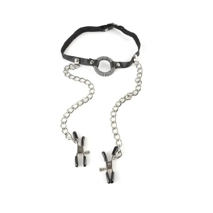 FETISH FANTASY O-RING GAG WITH NIPPLE CLAMPS, consigue grandes sensaciones con esta mordaza con pinzas para los pezones.