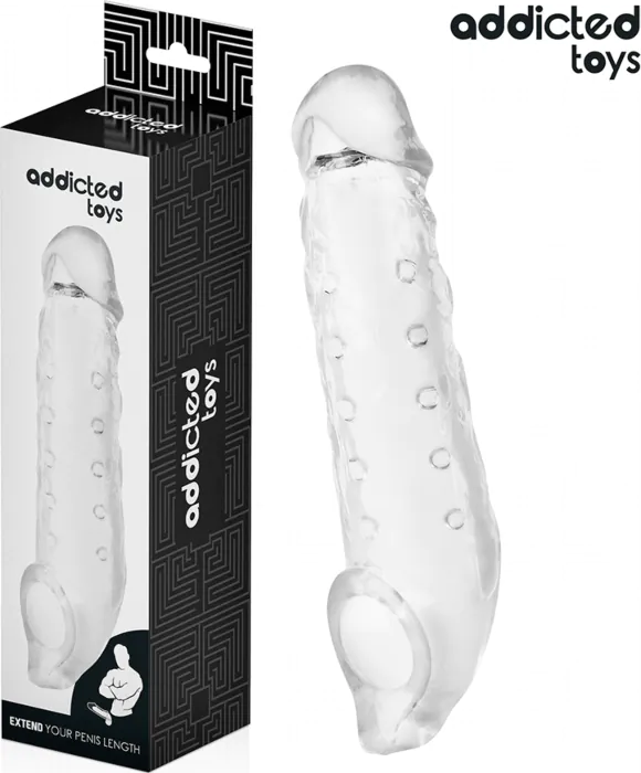 Aumenta tu longitud y grosor de forma temporal con la funda para el pene Addicted Toys M. Fabricada en material transparente de alta calidad, permite ver el proceso de uso sin distracciones y mejora el rendimiento sexual con comodidad.
