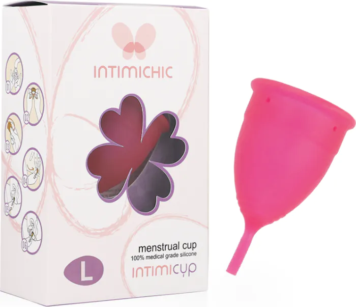 Copa menstrual reutilizable de Intimichic en talla L, fabricada en silicona médica. Indicado para quienes buscan una opción cómoda y segura durante su menstruación.