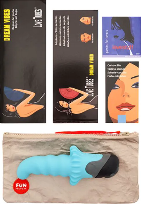 Placer erótico y diversión se combinan en el Juego Dream Vibes. Incluye un vibrador Stubby sumergible de Fun Factory y 14 misiones secretas para explorar tu intimidad con tu pareja. Recomendable para quienes buscan añadir un toque de aventura a sus noches, este juego promete risas y sensaciones intensas.