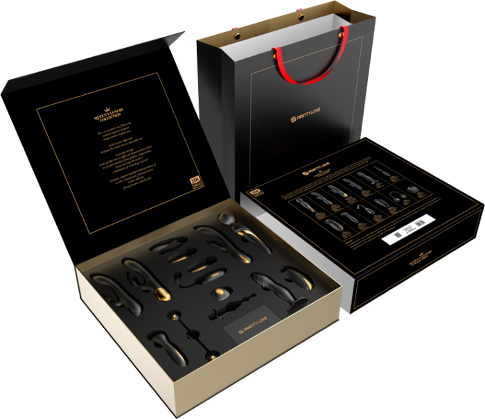 Placer elevado al máximo con el Kit de Lujo de Pretty Love, que incluye 12 juguetes eróticos que combinan vibración, succión y elegancia. Todos están fabricados en silicona suave y presentan adornos de oro de 18k o 24k, ofreciendo un toque de sofisticación que no encontrarás en otros kits.