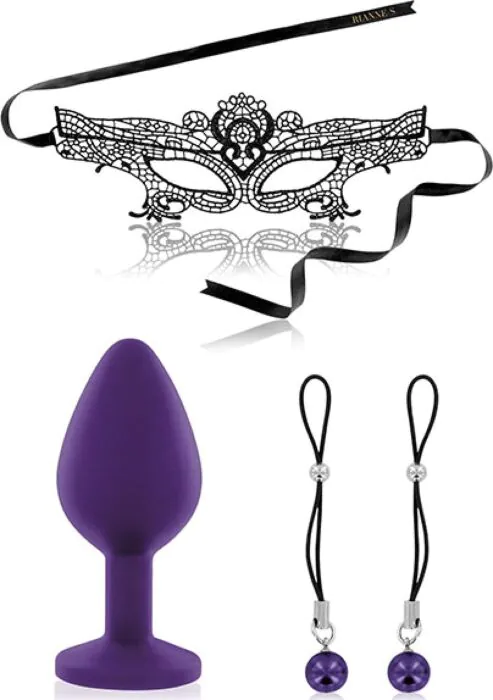 Para quien busca un kit de iniciación al bondage sensorial: antifaz, plug y colgantes para pezones en un solo set.