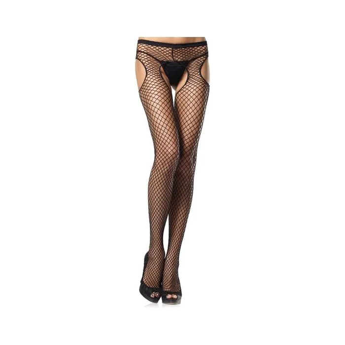 - Pantys negros de red tipo industrial con aberturas en la entrepierna y en la cadera, simulando un liguero.