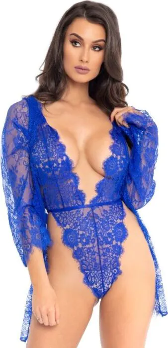 Dale un giro a tu intimidad con este set de lencería de Leg Avenue. Incluye un teddy de encaje floral y una bata a juego, perfectos para añadir un toque de sensualidad a tus noches.