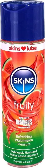 Lubricante a base de agua SKINS Fruity Sandía (130 ml) con auténtico sabor a sandía y sin azúcar. Perfecto para sexo oral y juegos en pareja; no mancha y es compatible con preservativos y juguetes. Formato práctico para llevar y reaplicar; si buscas mayor duración en piel, valora un lubricante de silicona.