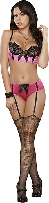 Este conjunto de lencería de Exposed en color rosa y negro combina encaje y satén para una apariencia seductora. Recomendable para quienes quieren añadir un toque de sensualidad a su ropa interior.