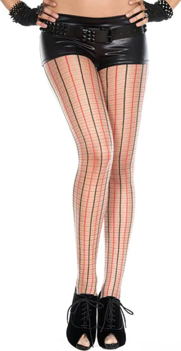 Son unas pantys/medias de la marca Music Legs con un patrón de cuadros en rojo y negro. Funcionan como complemento visual para tus conjuntos de lencería; aportan contraste y un punto atrevido sin recurrir a piezas complicadas. En tienda te las enseñaría para que veas cómo marcan sobre tejidos y cómo combinan con ligueros o otras medias.