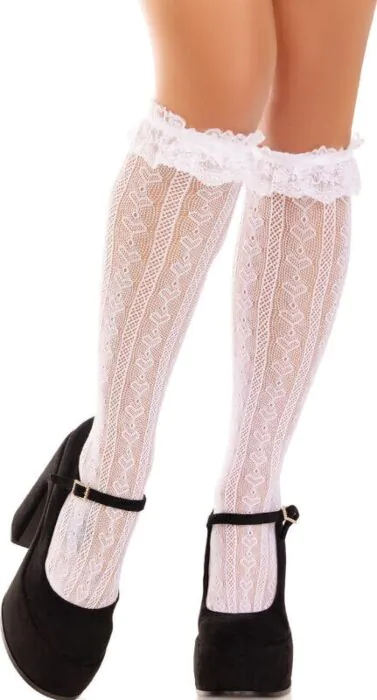 | Diseño | Medias hasta la rodilla con puño de volantes y escote corazón |