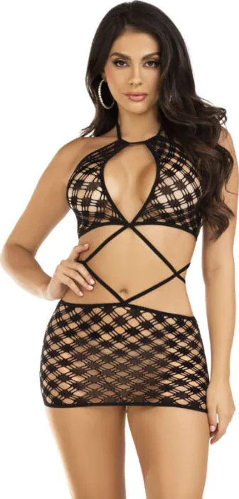 Atrévete a mostrar tus curvas con este minivestido de red de Leg Avenue. Su diseño abierto y ajustado resalta la figura, recomendable para el dormitorio o una salida atrevida.