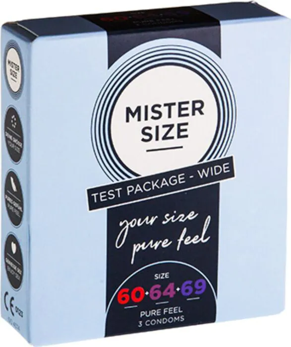 Prueba el pack de tres preservativos Mister Size con medidas 60, 64 y 69 mm. Diseñados para un ajuste cómodo y natural. ¡Encuentra la talla recomendable!