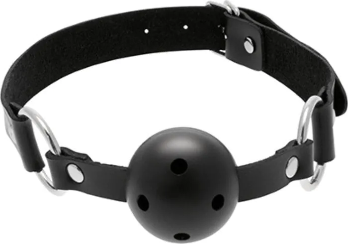 Esta es una mordaza bola con aberturas para respirar sin incomodidades, pensada para quienes practican BDSM y quieren un control claro sin eliminar la posibilidad de ventilación. La bola, de goma/ABS, queda sujeta con aros metálicos a una tira de cuero que se abrocha con hebilla, por lo que el conjunto es sencillo y robusto. Pensada para uso en pareja bajo supervisión y comunicación continua.