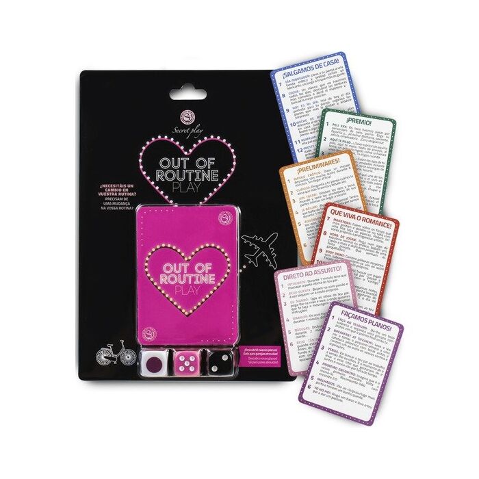 ¡Dale un giro excitante a tu vida íntima con el emocionante juego "Out of routine play" de Secret Play! Aviva la pasión y rompe con la monotonía junto a tu pareja. ¿Estás listo para descubrir nuevas experiencias y disfrutar de desafíos emocionantes? ¡Lanza los dados y sumérgete en un mundo de diversión y pasión!