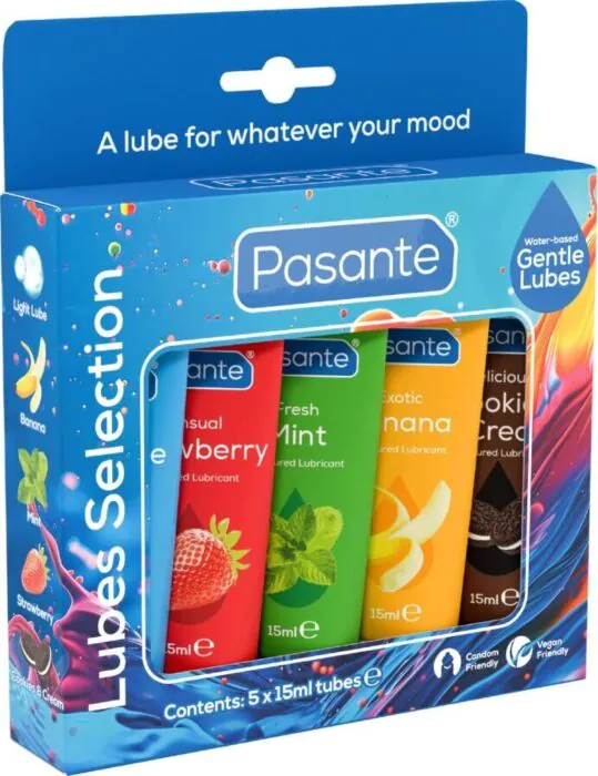 Pack de 5 mini lubricantes a base de agua de PASANTE: tubos de 15 ml con sabores (fresa, menta, plátano, chocolate y otro suave). Perfecto si buscas probar sabores distintos, llevar en el bolso o usar en pareja con condón y juguetes. Tamaño de viaje, fórmula no pegajosa y apta para sexo oral; una opción cómoda y discreta para uso ocasional.