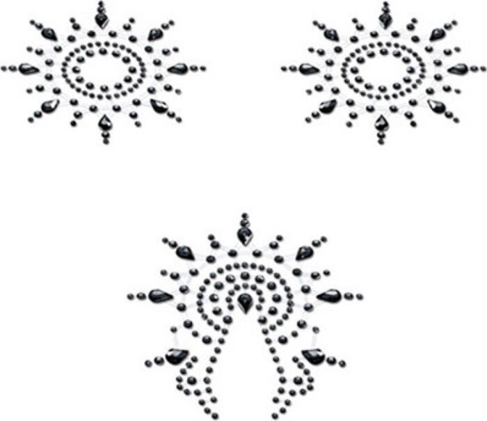 Estas pezoneras Petits Joujoux Gloria son una decoración corporal pensada para quien quiere enfatizar el pecho o la zona del pubis con brillo y elegancia. Incorpora más de 300 piedras brillantes adhesivas que dan un efecto llamativo sin necesidad de costuras ni sujecciones complejas. SET OF 3. Color: BLACK/PINK. Cristales que se pegan a la piel mediante adhesivos. Diseñado para pechos y pubis. Se pueden llevar bajo la lencería o mostrar para strip-tease.