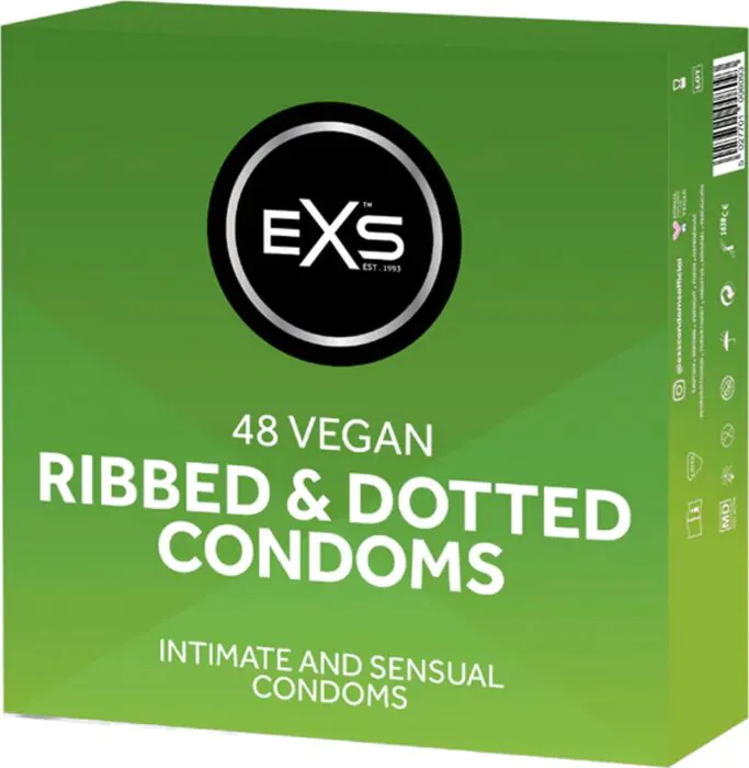 Caja de 48 preservativos de látex natural con estrías y puntos para aumentar la estimulación durante la relación. Con depósito y lubricante de silicona para un deslizamiento prolongado. Anchura nominal 56 mm y 190 mm de longitud: ajuste confortable pensado para la mayoría de usuarios. Veganos y testados electrónicamente para mayor seguridad.