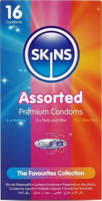Añade variedad a tus encuentros íntimos con el pack surtido de condones Skins. Con 16 unidades en diferentes texturas y un sutil aroma a vainilla, disfrutarás de una experiencia particular y segura.