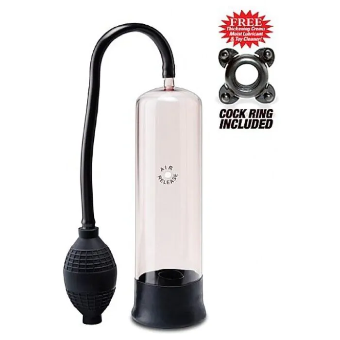 La bomba de erección novato del A Pump Worx tiene un boquilla elástica que crea un sello perfecto, un cilindro trasparente que te permite ver lo que pasa, es 100% libre de Phalatos y un botón de liberación rápida de presión.