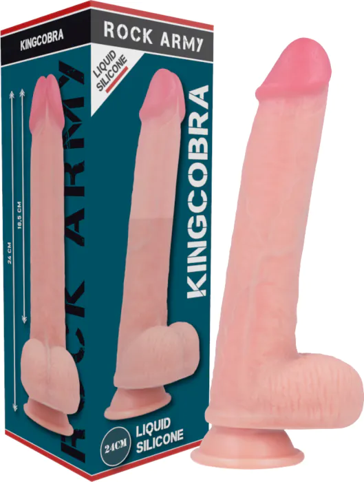 Estimulación realista y cómoda con el dildo Kingcobra de Rock Army, fabricado en silicona líquida hipoalergénica que se adapta perfectamente a tu cuerpo. Con 24 cm de longitud y un grosor de 4.77 cm, su diseño ergonómico y su base de ventosa te permitirán disfrutar sin manos y en cualquier superficie plana.