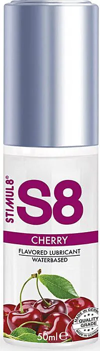 Lubricante a base de agua S8 sabor cereza: una fórmula suave, duradera y apta para besar. Pensado para quienes quieren un lubricante comestible, sin parabenos ni ftalatos y compatible con juguetes y preservativos. Tamaño práctico de 50 ml para llevar o probar una nueva sensación sin compromiso.