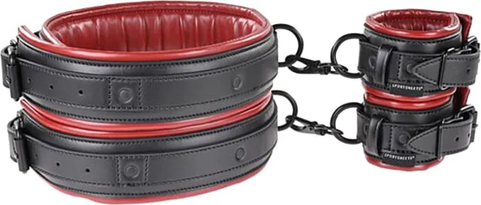 Conjunto de esposas que une muslo y muñeca en un mismo elemento, pensadas para juegos BDSM cómodos y controlados. Acolchadas, regulables y con sistema de hebillas y clips que permite varias configuraciones. Para parejas que buscan reducir movilidad sin renunciar al confort; no es un equipo para suspensiones o cargas de peso.