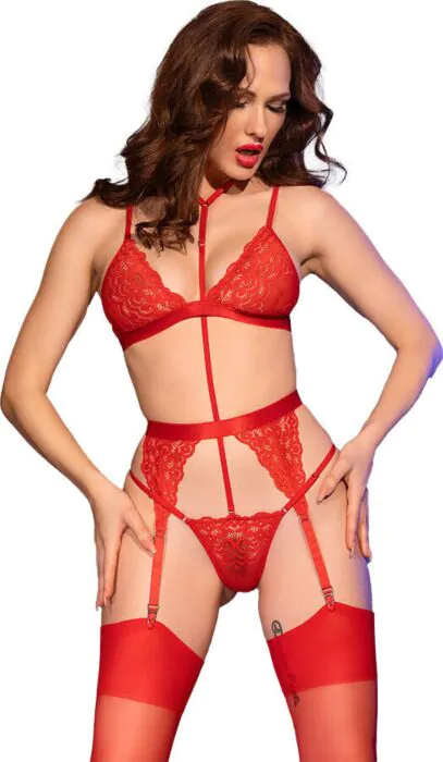 Colócate el sujetador ajustando las tiras en la espalda hasta sentir sujeción cómoda; el encaje elástico permite cierto margen de adaptación. El tanga incorpora un cordón que pasa alrededor del cuello como efecto gargantilla: comprueba que no apriete demasiado para evitar molestias. El liguero viene pensado para sujetar medias tipo cabaret incluidas o similares; ajusta las cinturillas para que queden firmes sin cortar la circulación.