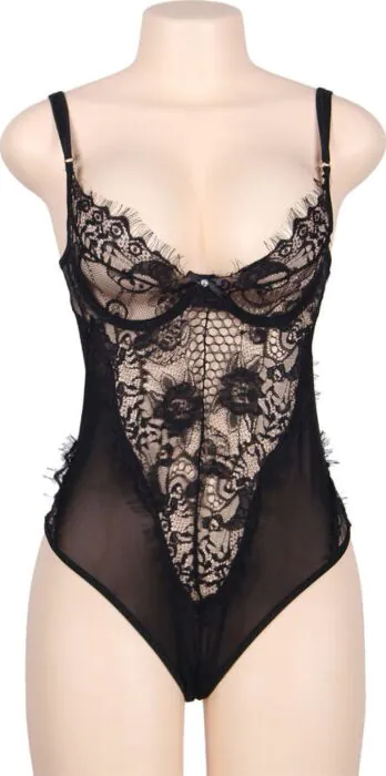La talla Queen plus indicada para este teddy corresponde a EU 44, USA 14, UK 16, IT 50, FR 44 y RU 52. Si dudas entre tallas, valora el corte: al ser encaje con transparencias suele tener algo de elasticidad, pero mide tu contorno de pecho y cadera para asegurarte.