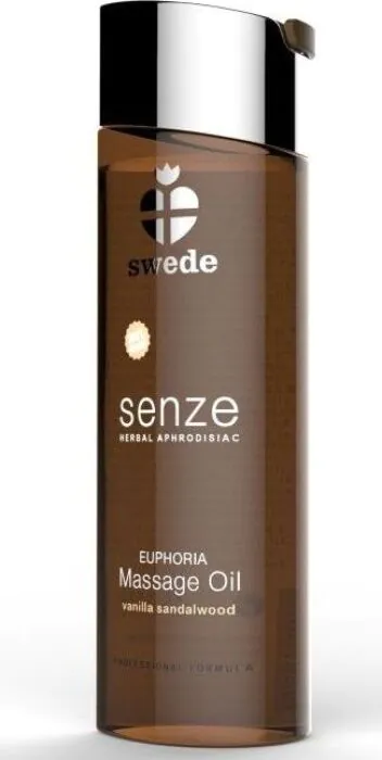 Aceite de masaje vegano SWEDE Euphoria con aroma a vainilla y sándalo. Fórmula a base de aceites vegetales y aceites esenciales puros, diseñado para masajistas profesionales y parejas que buscan una sensación cálida y aromática. Se presenta en envase de cristal de 75 ml y se puede calentar en baño maría hasta 45 °C para intensificar el aroma.