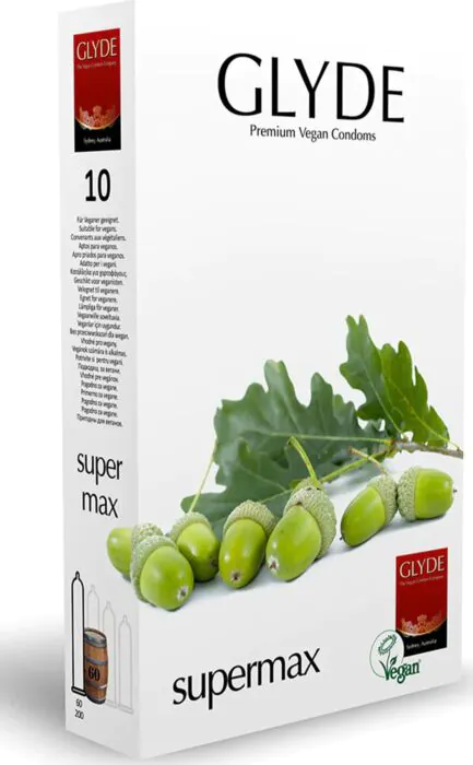 Los preservativos Glyde Ultra Supermax son 100% veganos y de tamaño extra grande, indicados para quienes buscan comodidad sin sacrificar sus principios. Caja de 10 unidades.