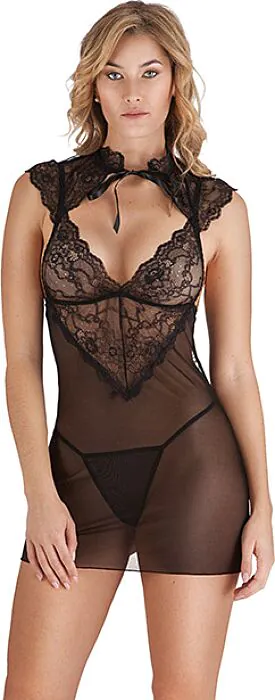 Este vestido de lencería combina cómodas transparencias con encajes florales, ideal para quienes buscan un toque seductor en sus noches. Incluye tanga.