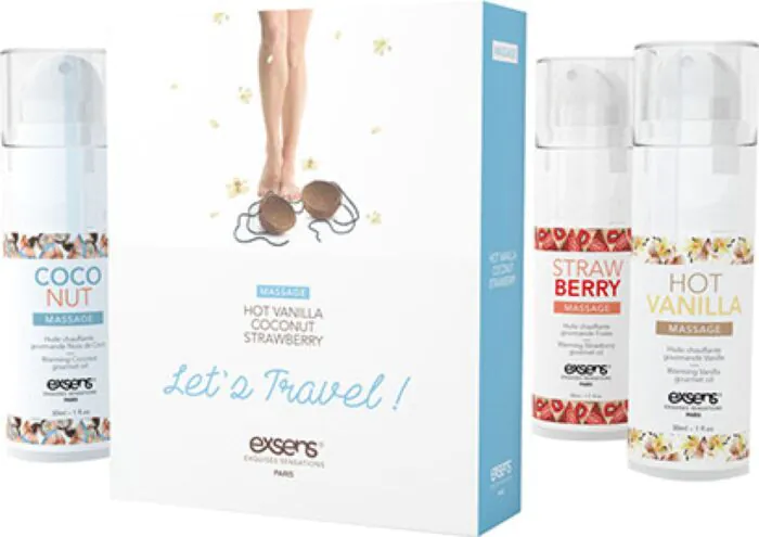 Kit de viaje con 3 aceites de masaje comestibles y efecto calor en sabores Fresa, Coco y Vainilla. Recomendable para quienes quieren añadir un toque sensual a sus masajes.